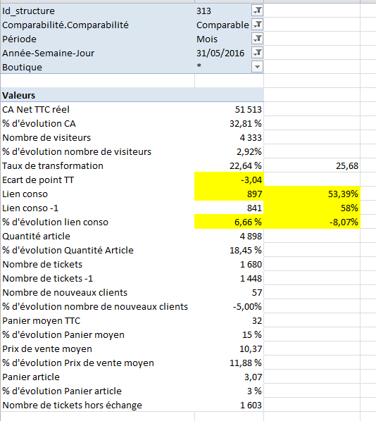 · le lien conso exprimé dans le cube en valeur (volonté des responsable de réseau) et sur Mobile en % sur le nombre de ticket (BI 10 tickets rattachés à un client sur 50 tickets réalisés dans la journée et sur Mobile tu vas avoir 20% de lien). L’évolution lié à cette indicateur est lui aussi différent puisqu’il exprime une évolution d’un taux.