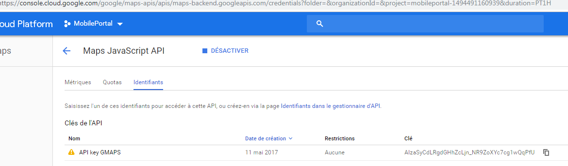 Création de l'Api google Maps (XG + KG : pas de restrictions) : AIzaSyCdLRgdGHhZcLjn_NR9ZoXYc7cg1wQqPfU et insertion dans app.js